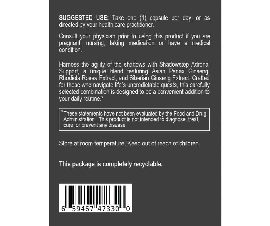 Harness the agility of the shadows with Shadowstep Adrenal Support, a unique blend featuring Asian Panax Ginseng, Rhodiola Rosea Extract, and Siberian Ginseng Extract. Crafted for those who navigate life’s unpredictable quests, this carefully selected combination is designed to be a convenient addition to your daily routine.